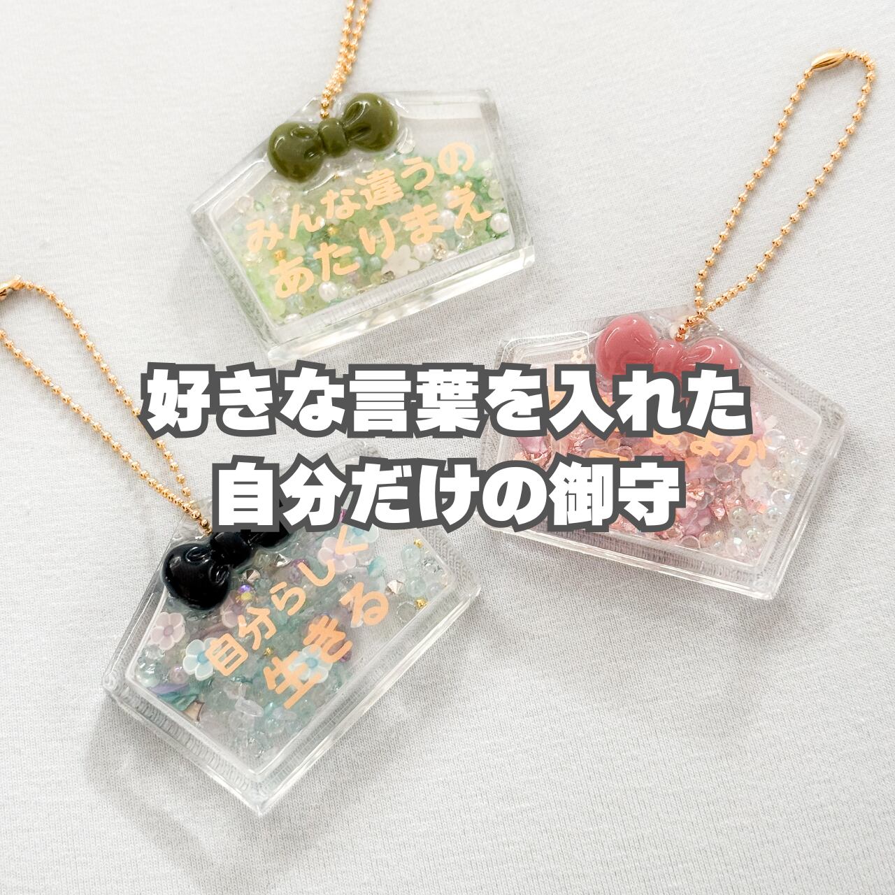 好きな言葉を入れてお作りする、オリジナルのかわいい透明おまもり(お守り)です。